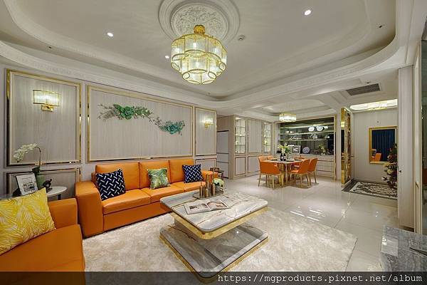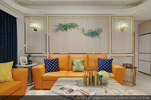 一進到客廳,高度的色彩馬上吸引了人們的目光,仔細一看,滑順的牛皮、亮橘色的色澤與大器的造型設計,讓牛皮沙發營造豪宅的奢華底蘊,更為空間增添了視覺的層次感。